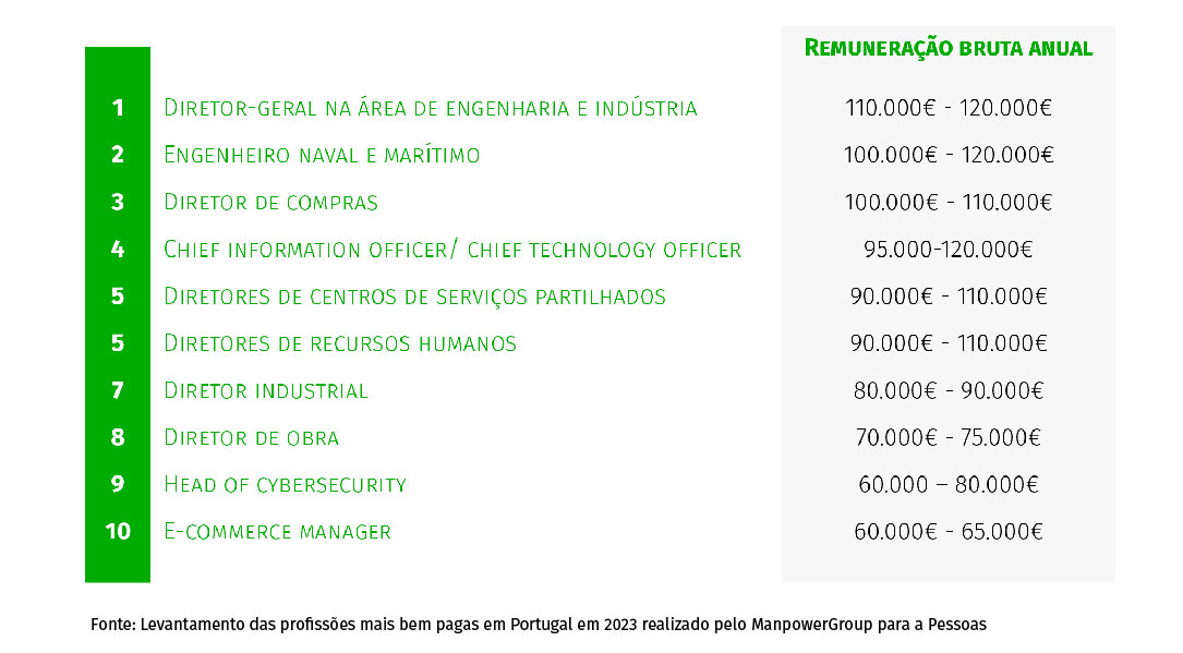 Então, um diretor-geral na área da Engenharia e Indústria pode facilmente alcançar os 120 mil euros brutos por ano, o que corresponde a um salário mensal de mais de 8570€.