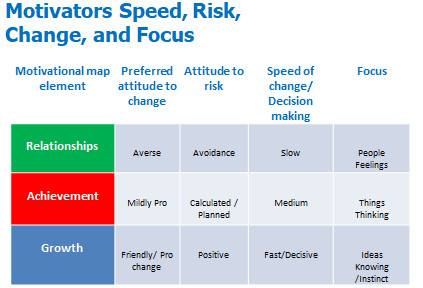 Se procura por uma pessoa para liderar uma equipa, um Diretor altamente motivador (com poder, influência, controlo nas pessoas e/ou recursos) é extramente útil. Se quer alguém que aplique mudanças e traga ideia novas, um Criador motivado é importante (procura inovação, identificação com novos e expressivos criativos) e se quer alguém organizado e que gosta da rotina, é importante um Defensor motivado.