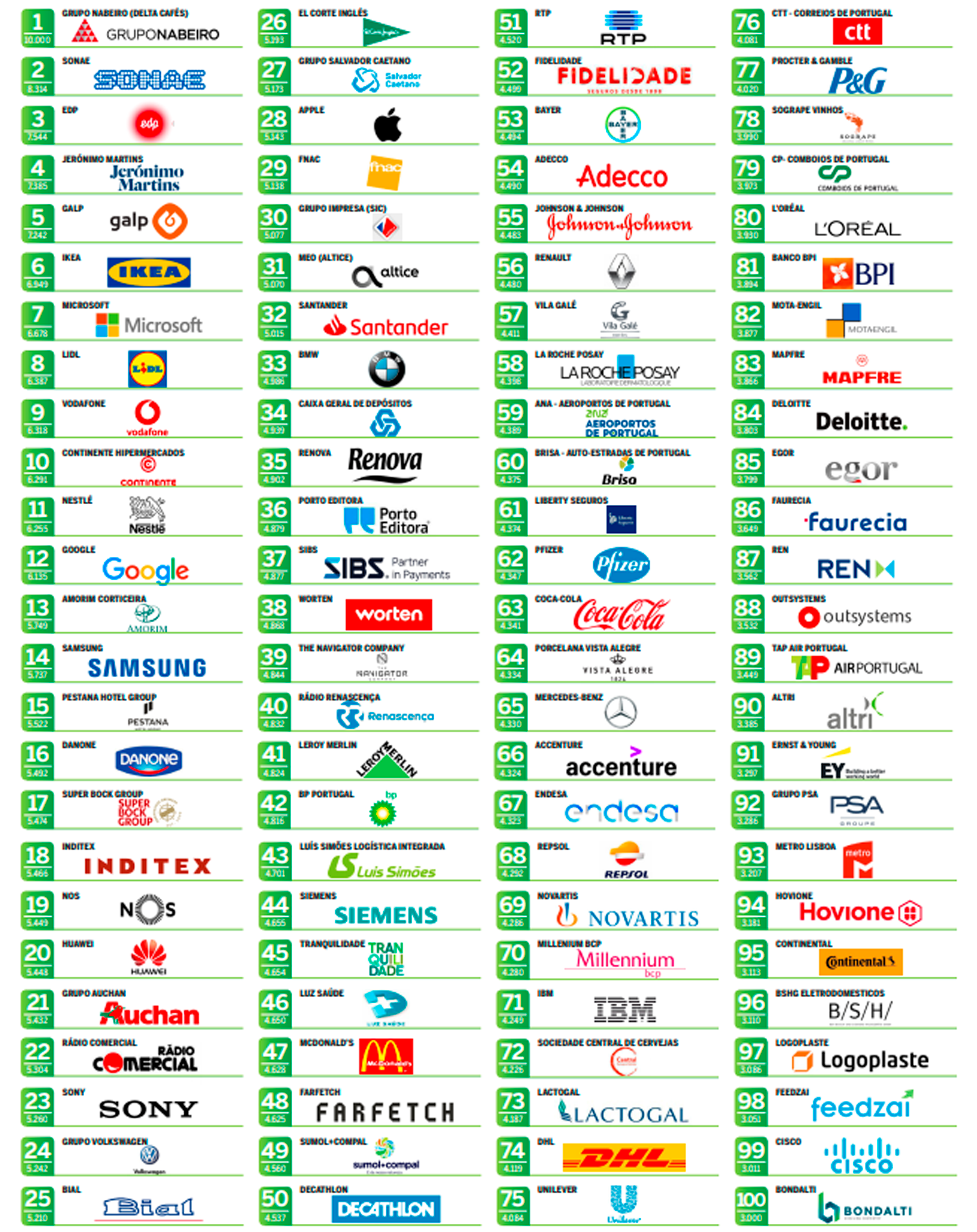 Seguem-se a Jerónimo Martins (4º lugar), Galp (5º), Ikea (6º), Microsoft (7º), Lidl (8º), Vodafone (9º) e Continente (10º), fica assim completo o top 10.