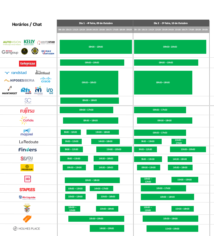 Assim, para se poder organizar, deixamos abaixo um resumo dos horários em que cada empresa estará presente, para poder decidir quais as alturas ideias para se juntar ao Job Summit: