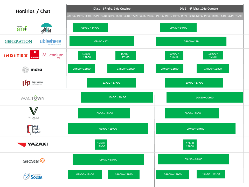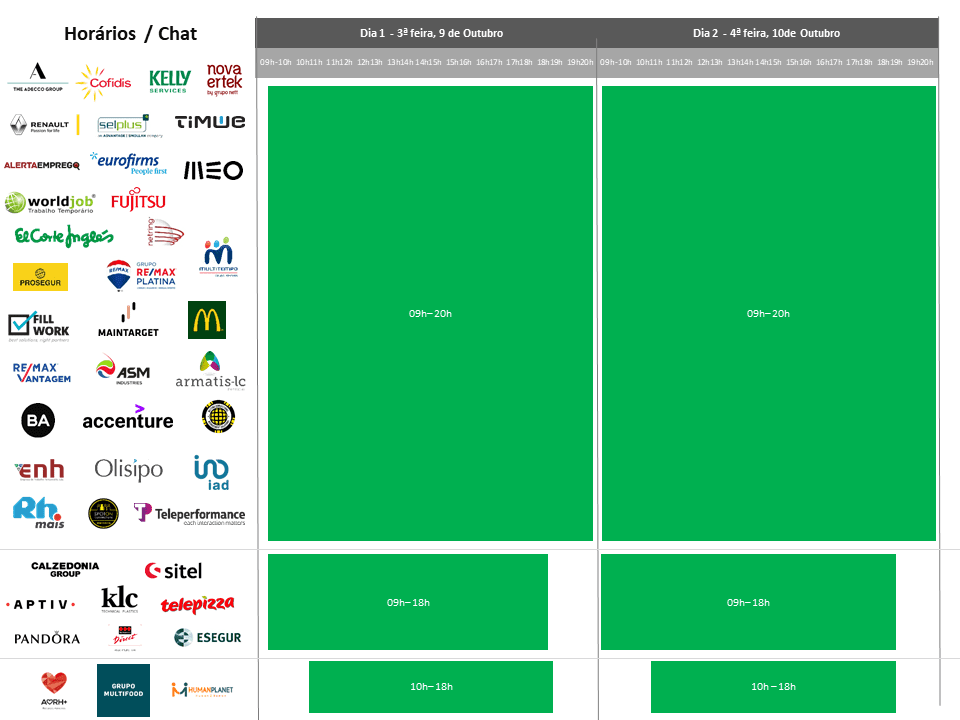 Assim, para se poder organizar, deixamos abaixo um resumo dos horários em que cada empresa estará presente, para poder decidir quais as alturas ideias para se juntar ao Job Summit: