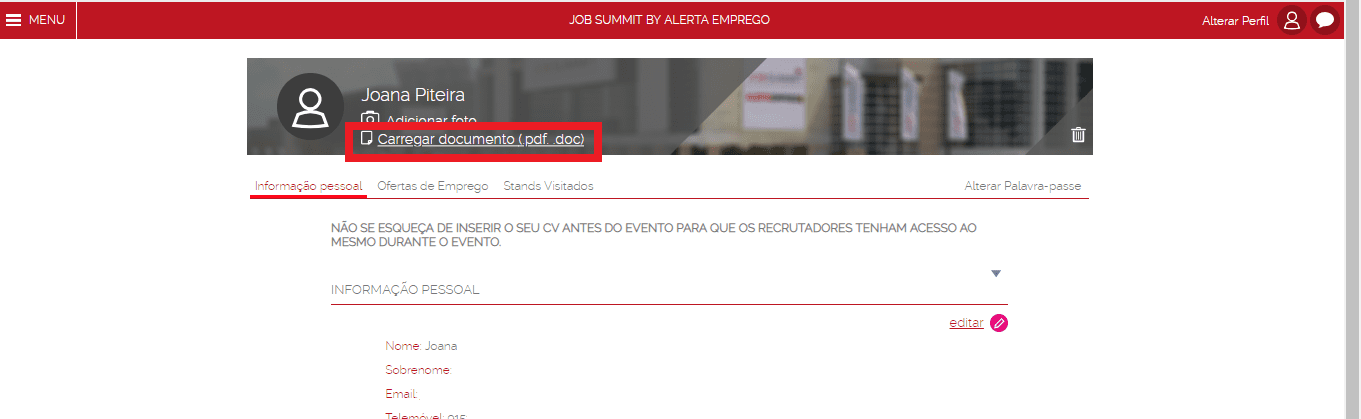 Para alterar algum dos seus dados pessoais clique em “editar”. Para adicionar ou seu currículo clique em “Carregar documento” ou caso pretenda alterar o mesmo clique em “Alterar documento”: