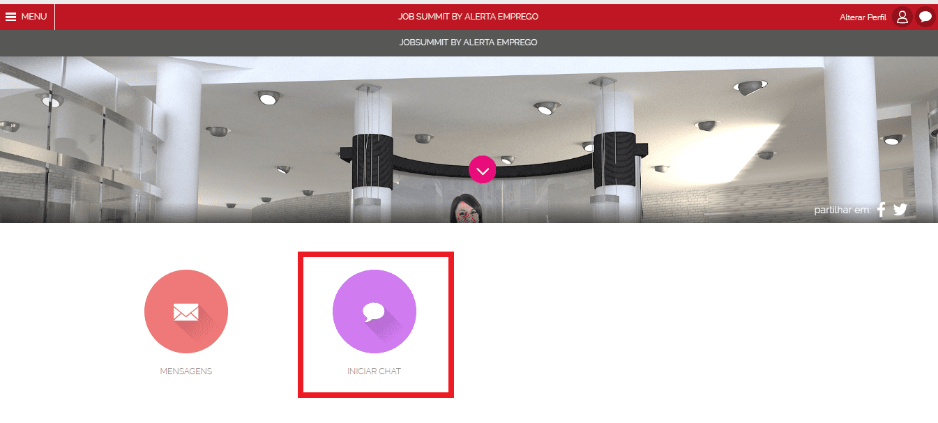 Para aceder aos chats poderá fazê-lo, como já vimos, através do stand das empresas em “iniciar chat”: