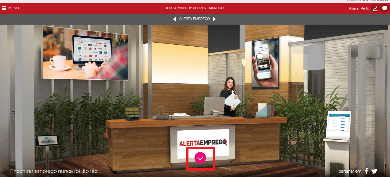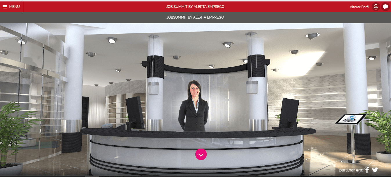 Depois de aceder ao stand e clicar na seta cor de rosa terá acesso a todas as informações disponibilizadas pelas empresas – descrição da empresa, ofertas de emprego, redes sociais, horários de chat, site da empresa, vídeos e imagens.