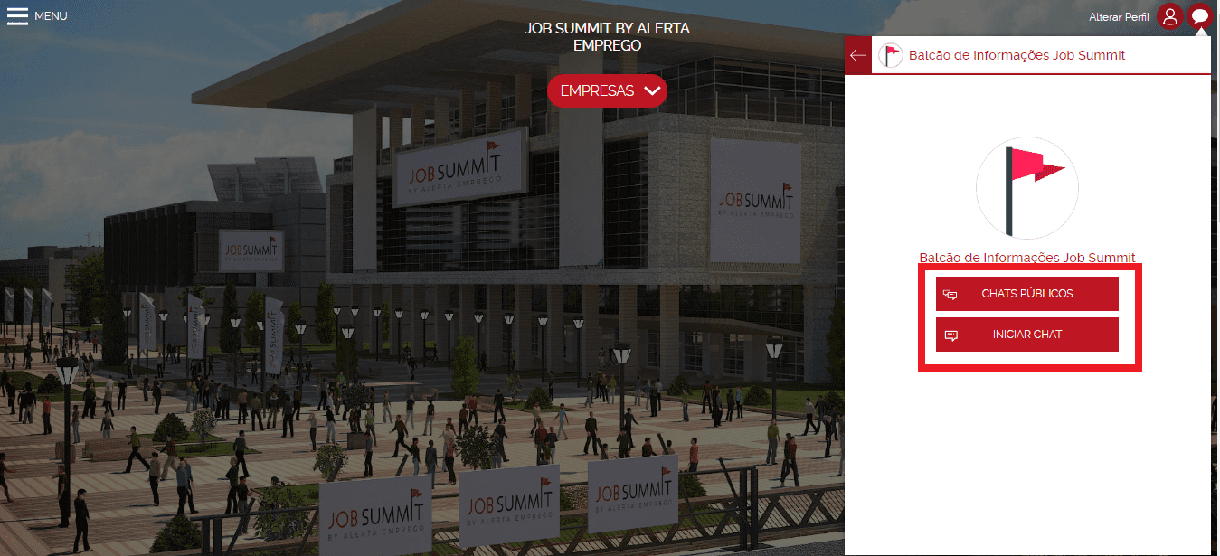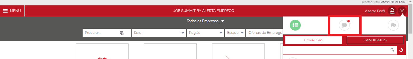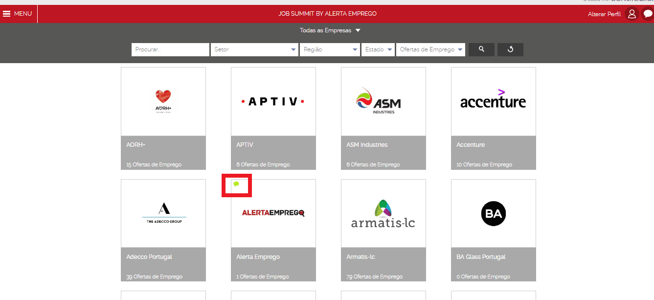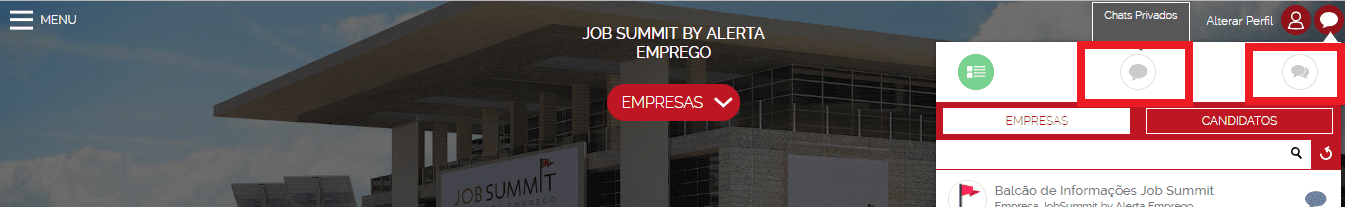 Para comunicar directamente com os recrutadores das empresas poderá fazê-lo através dos chats públicos (para a empresa de forma geral com os restantes candidatos) ou dos chats privados (para uma recrutador específico numa conversa pessoal).
