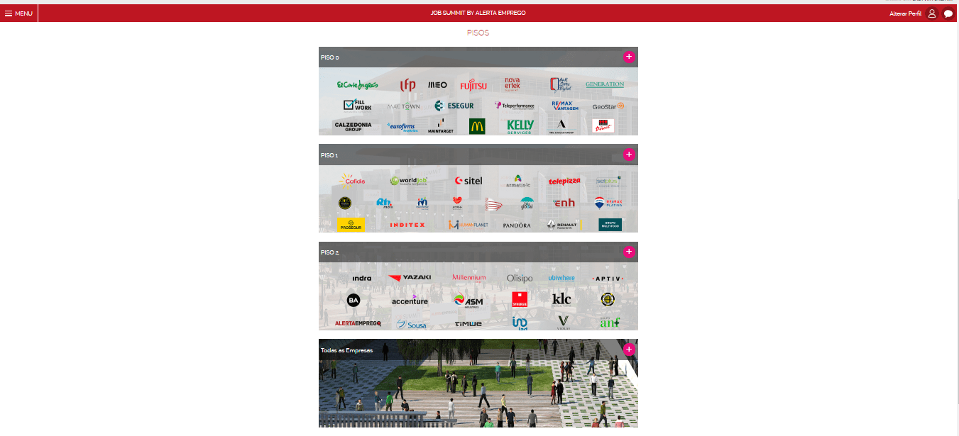 Ainda na entrada do evento, se clicar em “Empresas” terá acesso aos 3 pisos com diferentes empresas em cada um (piso 0 e 1 com empresas de diversas áreas e o piso 2 com empresas que recrutam na área das Engenharia e de IT).
