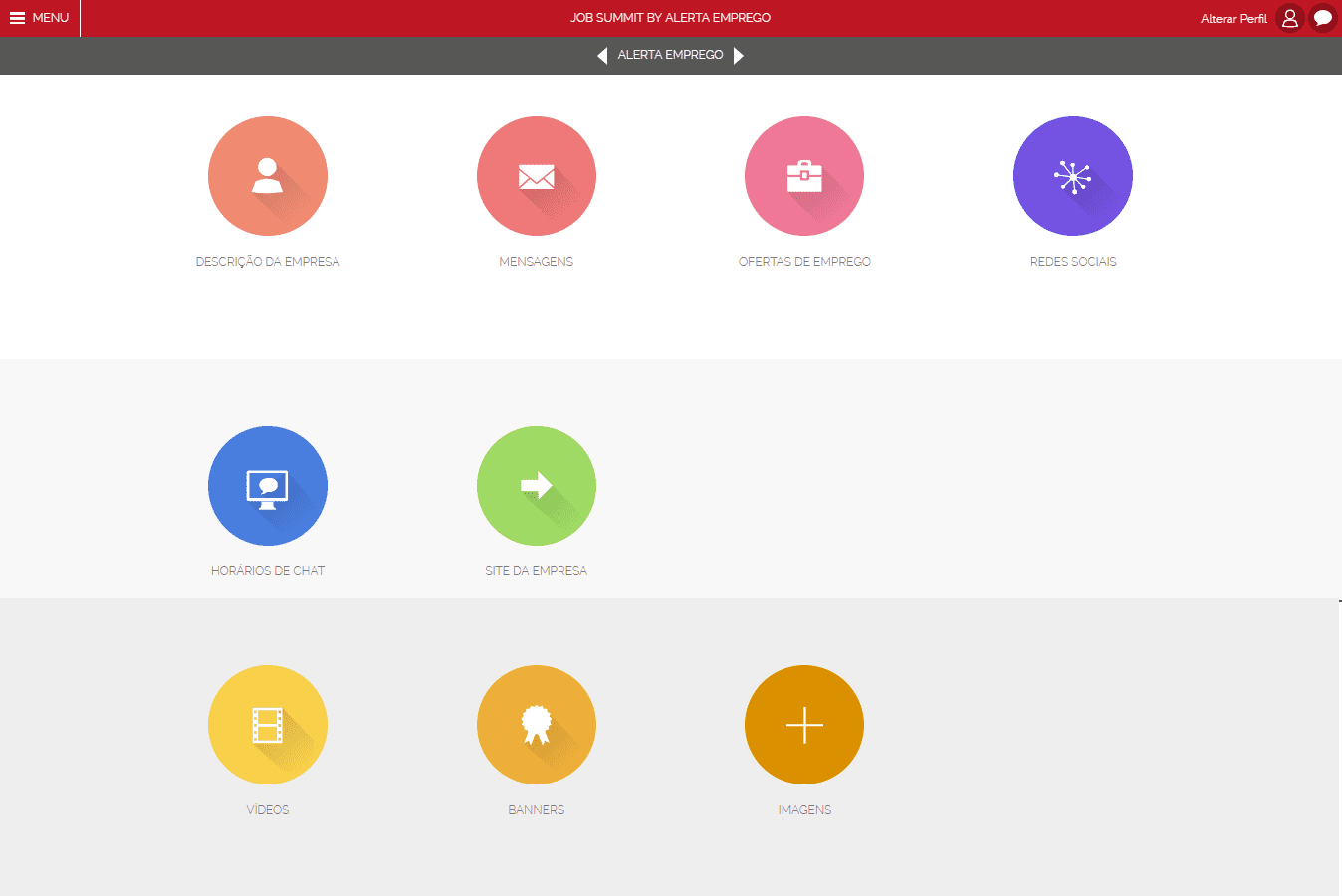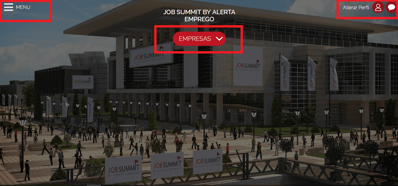 Ao fazer login e entrar no evento depara-se com uma página inicial onde tem acesso direto ao menu, à lista de empresas participantes, ao seu perfil e às salas de chat: