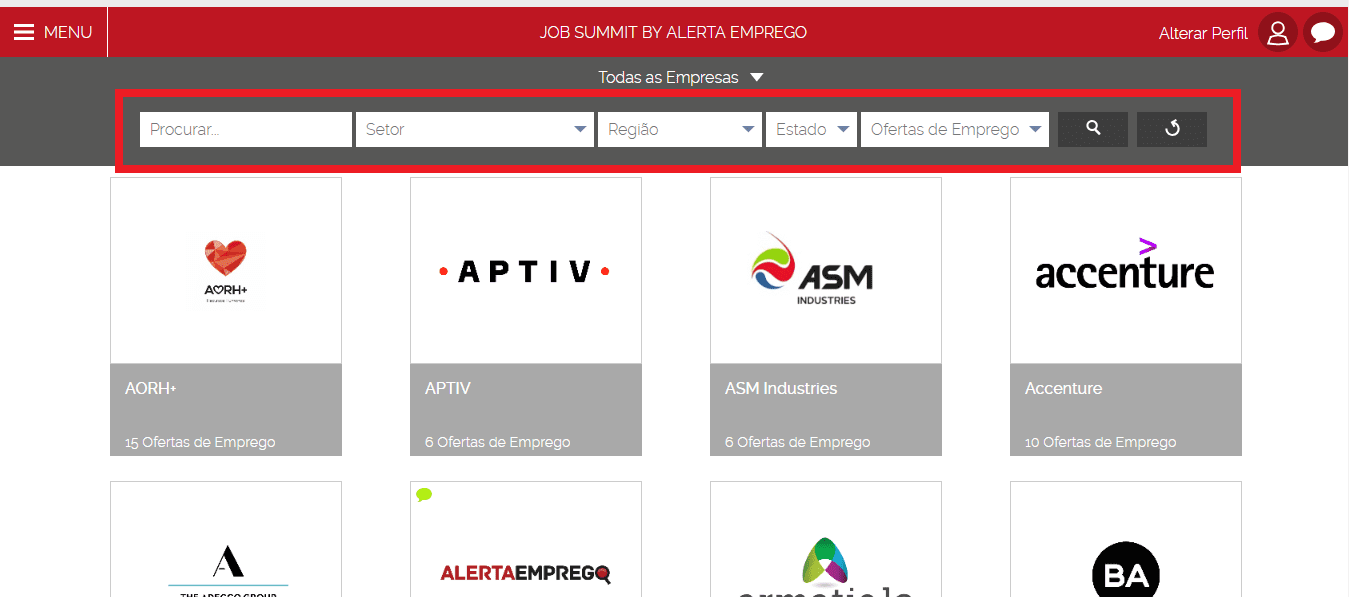 Aqui poderá consultar a lista completa e também filtrar e pesquisar filtrar por keywords, setores, regiões, estado da empresa (online ou offline) e por quantidade de ofertas de emprego: