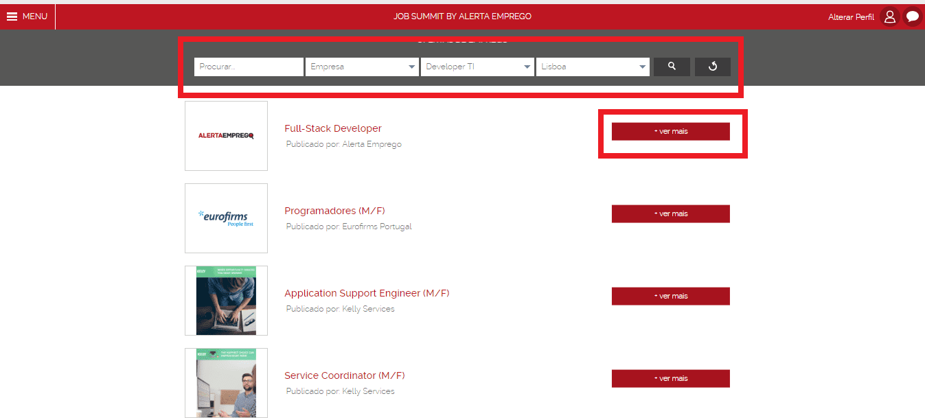 Para consultar uma oferta de emprego clique em “ver mais”: