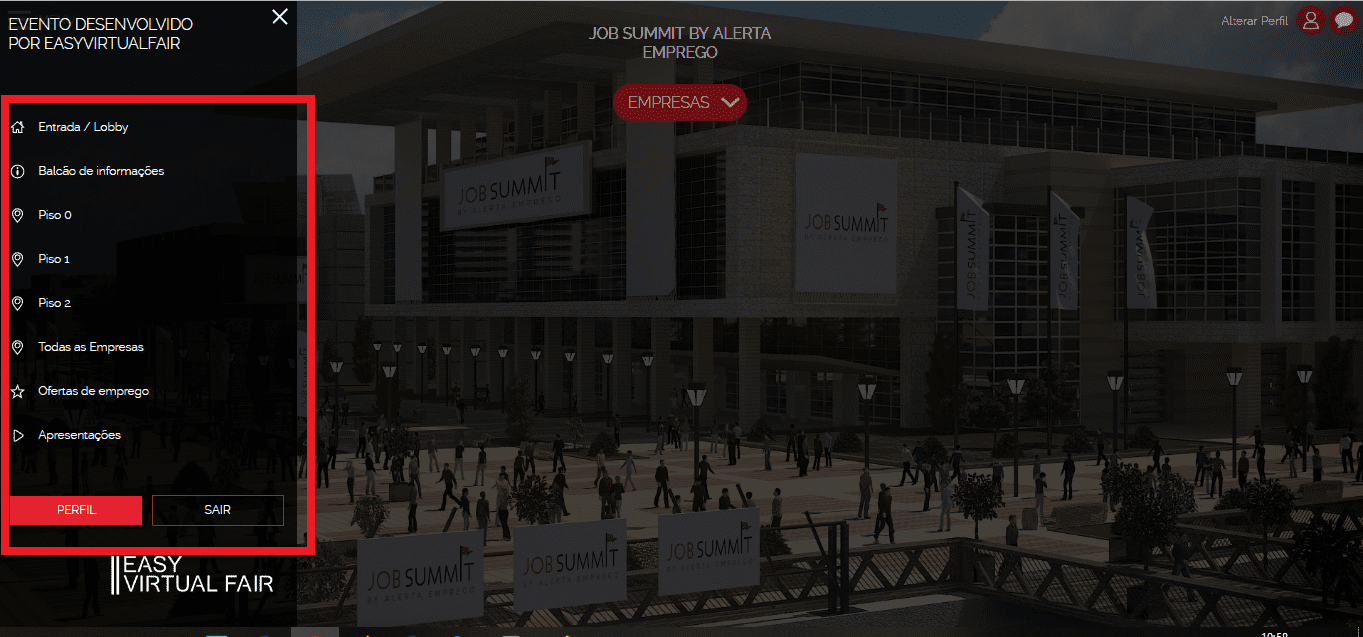 Ao clicar no botão Menu terá acesso a todas as secções do evento: entrada, balcão de informações, pisos, todas as empresas, ofertas de emprego e apresentações: