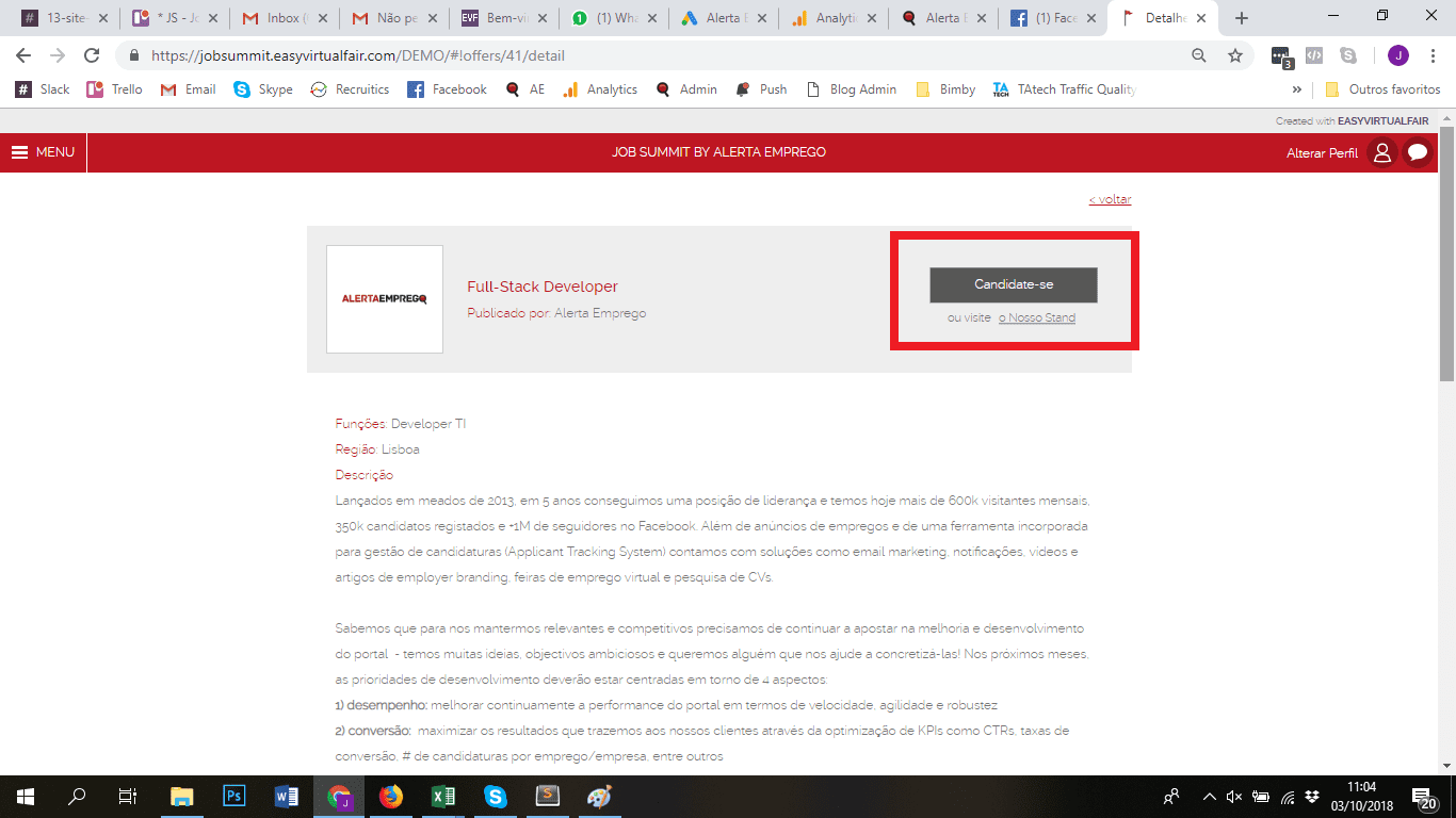 O Job Summit é uma feira de emprego 100% online e é o maior evento de recrutamento do país! Realiza-se nos dias 9 e 10 de outubro e conta já com 58 empresas confirmadas, mais de 230 recrutadores e milhares de vagas disponíveis!