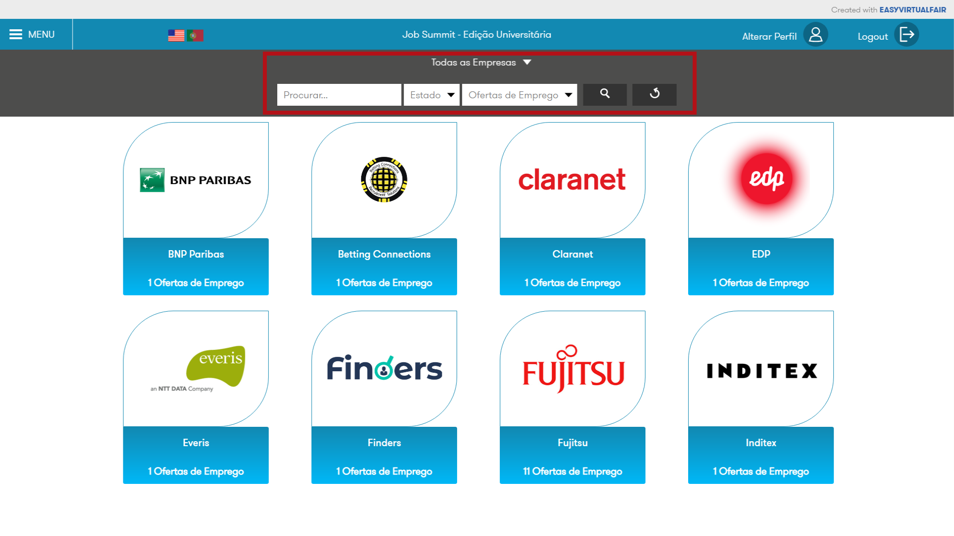 Também consegues visualizar a quantidade de ofertas que cada empresa tem ativa. No entanto, ao clicares no nome da empresa serás direccionado para o Stand da mesma: