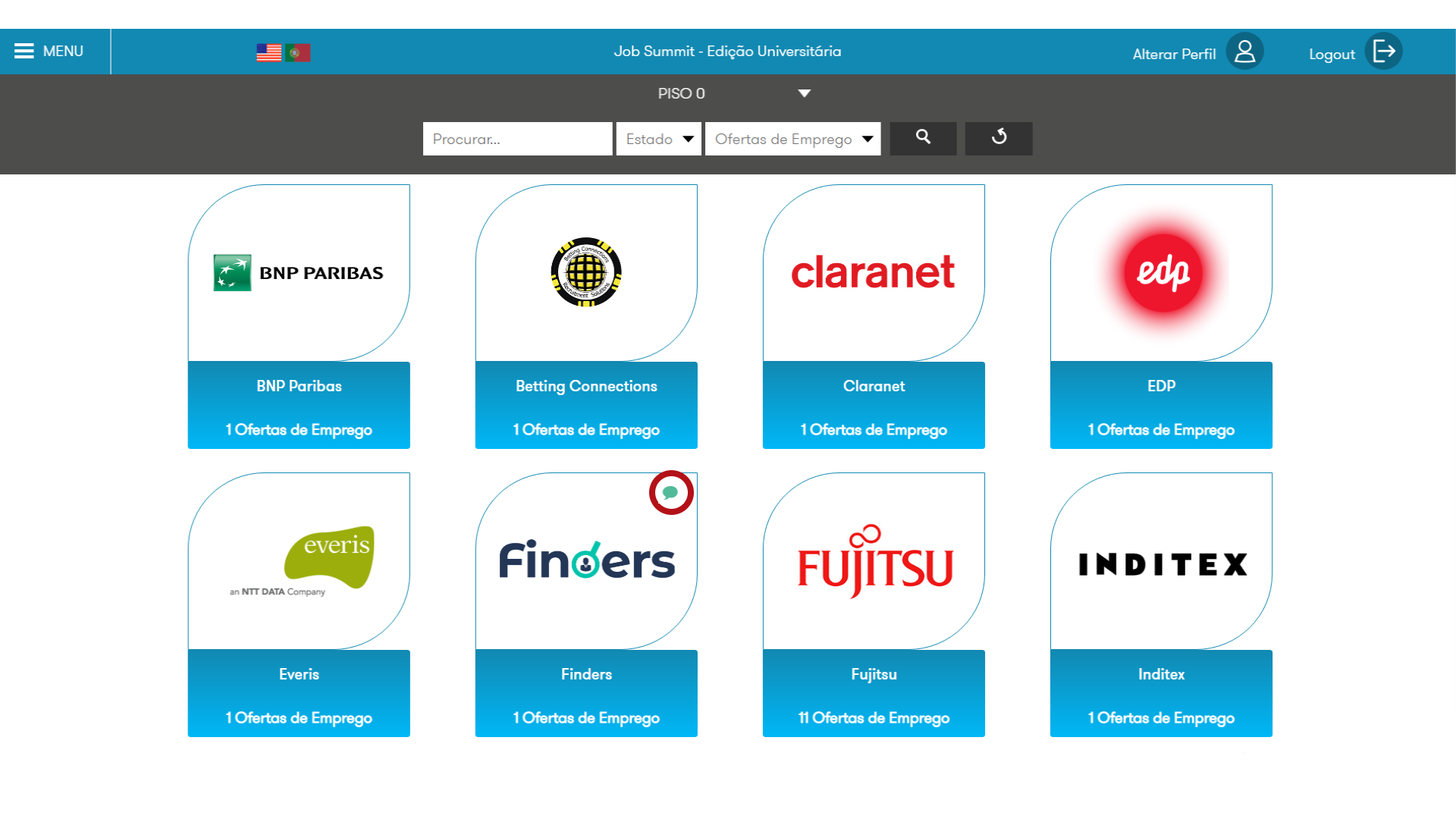 Ao clicares no botão Menu terás acesso a todas as secções do evento: entrada, balcão de informações, pisos, todas as empresas, ofertas de emprego, apresentações e horários de chat.