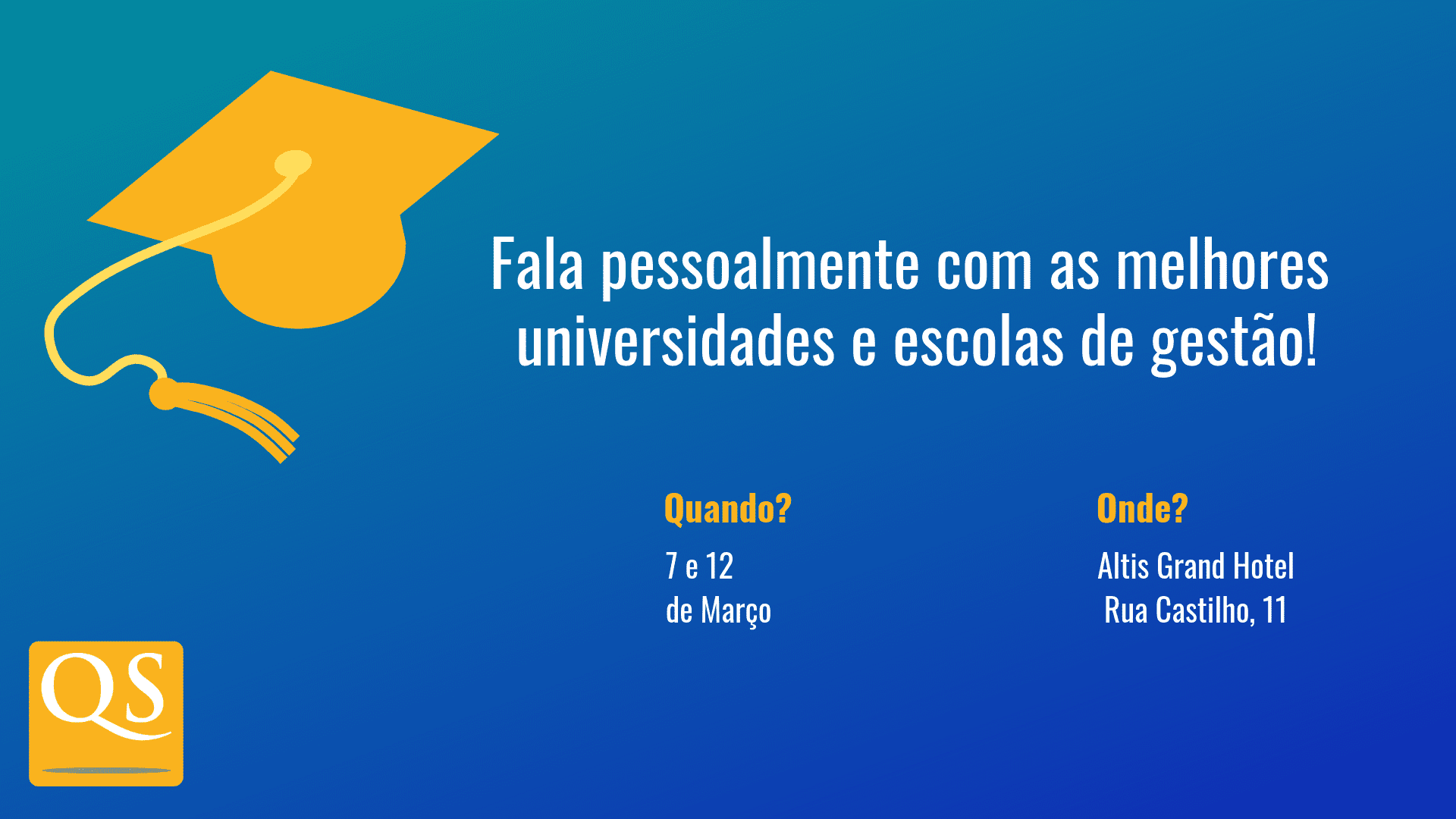 A QS Quacquarelli Symonds, empresa responsável pela publicação de alguns dos principais rankings universitários do mundo, regressa a Lisboa nos dias 7 e 12 de março com os seus eventos gratuitos de Mestrados (QS World Grad School Tour) e MBA (QS Connect MBA).